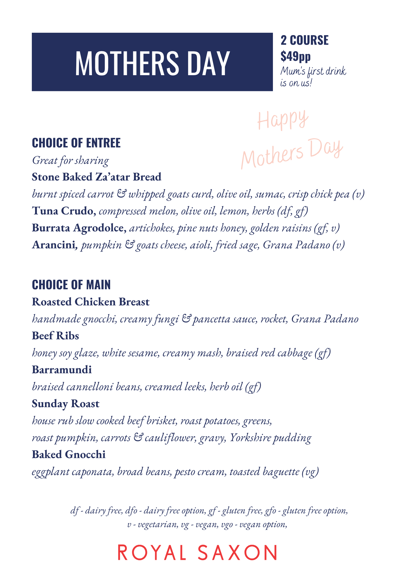 Treat Mum to a thoughtfully curated 2-course lunch designed for sharing moments and good conversation.